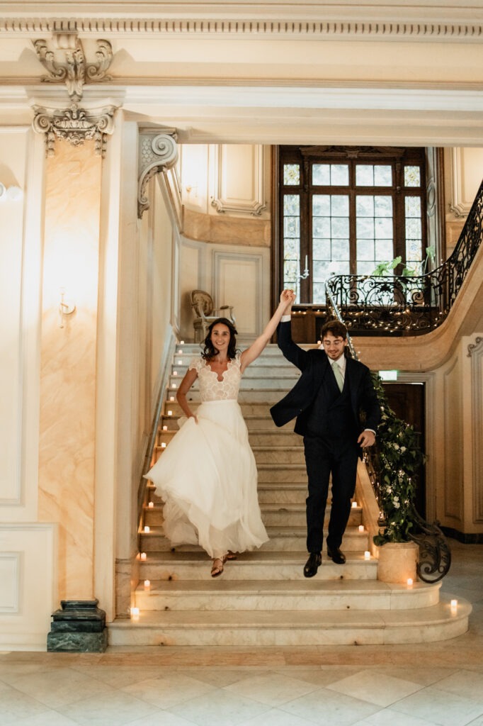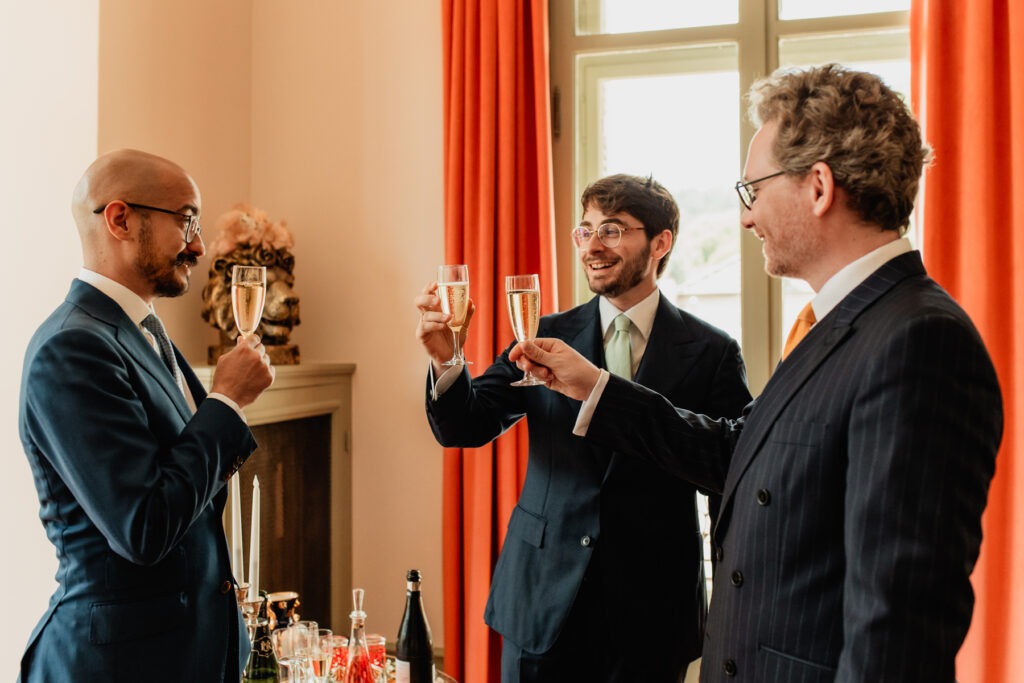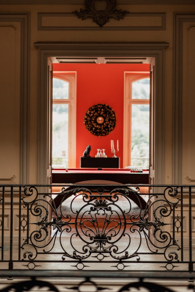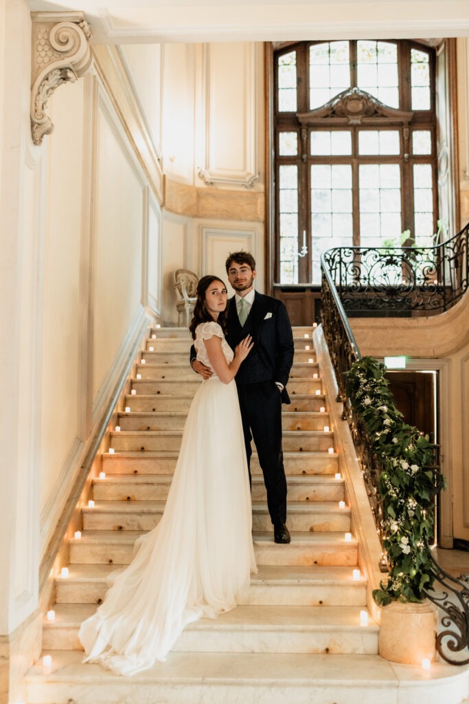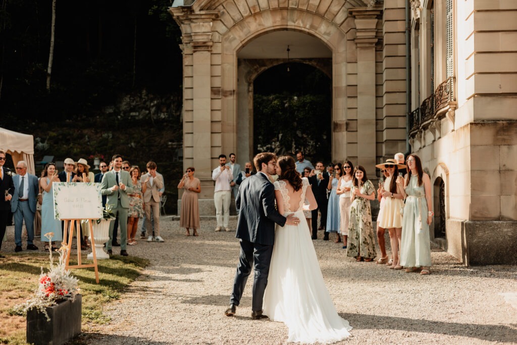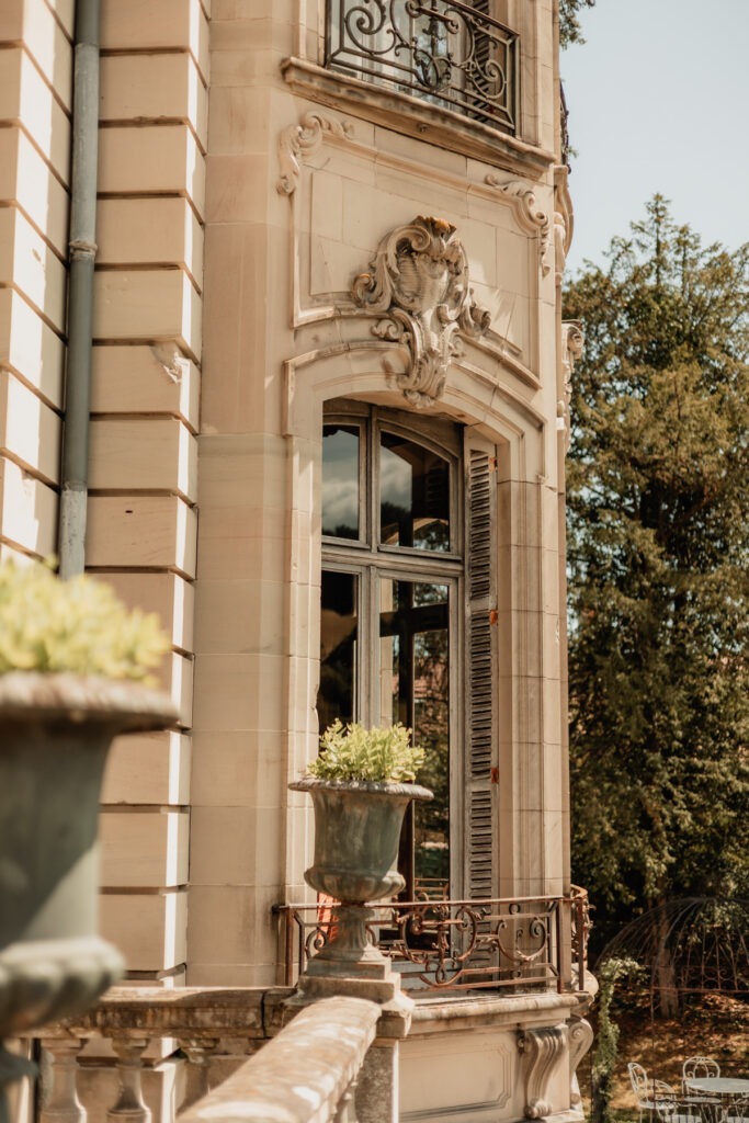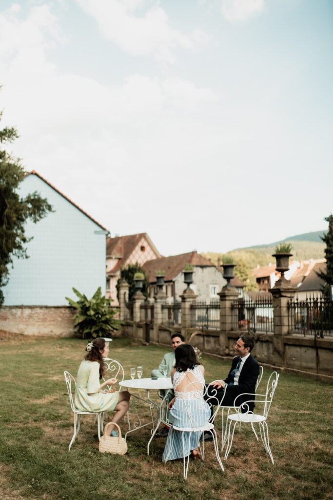 De retour au château, ils ont retrouvé leurs invités pour un cocktail convivial, avant de profiter à nouveau des extérieurs du Château Burrus en fin d’après-midi. La lumière déclinante a offert un cadre idéal pour des images douces et intemporelles.