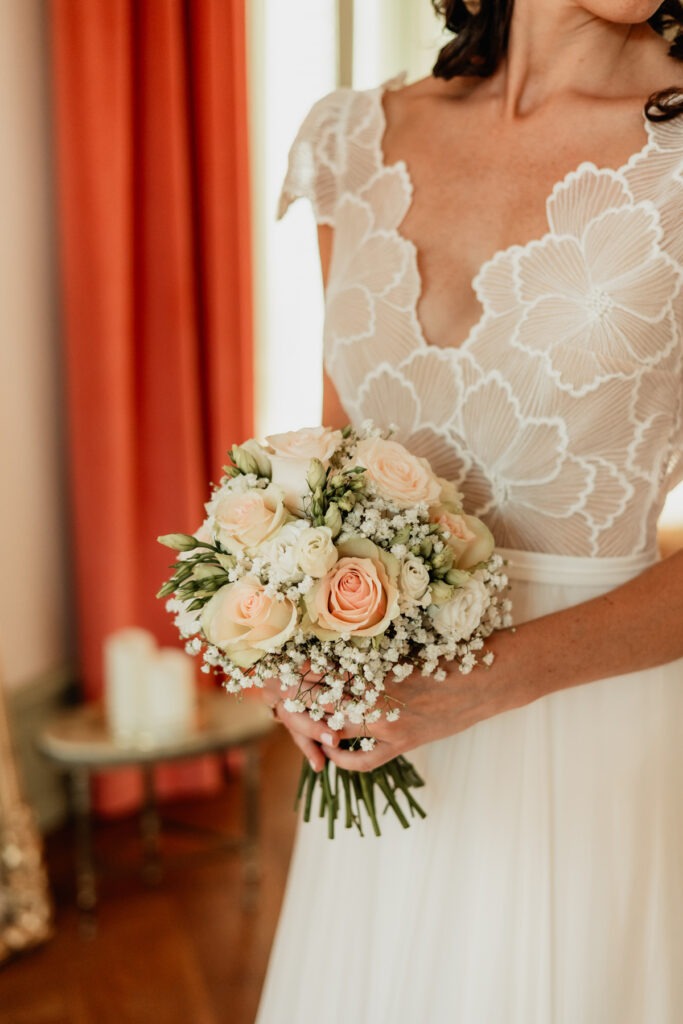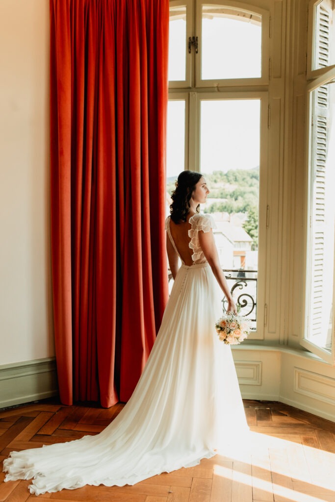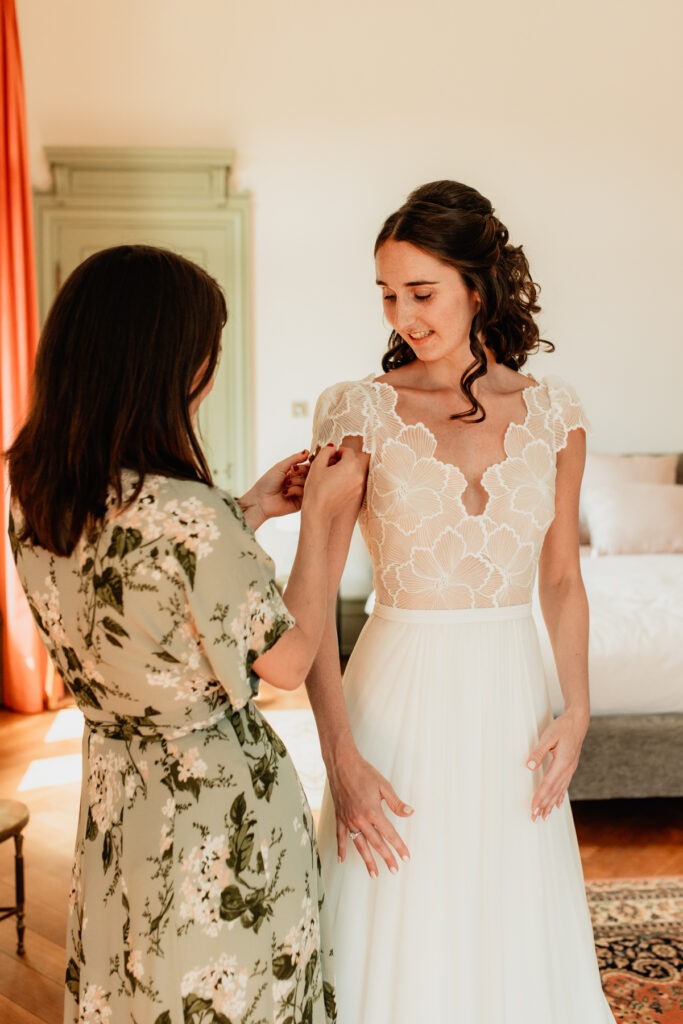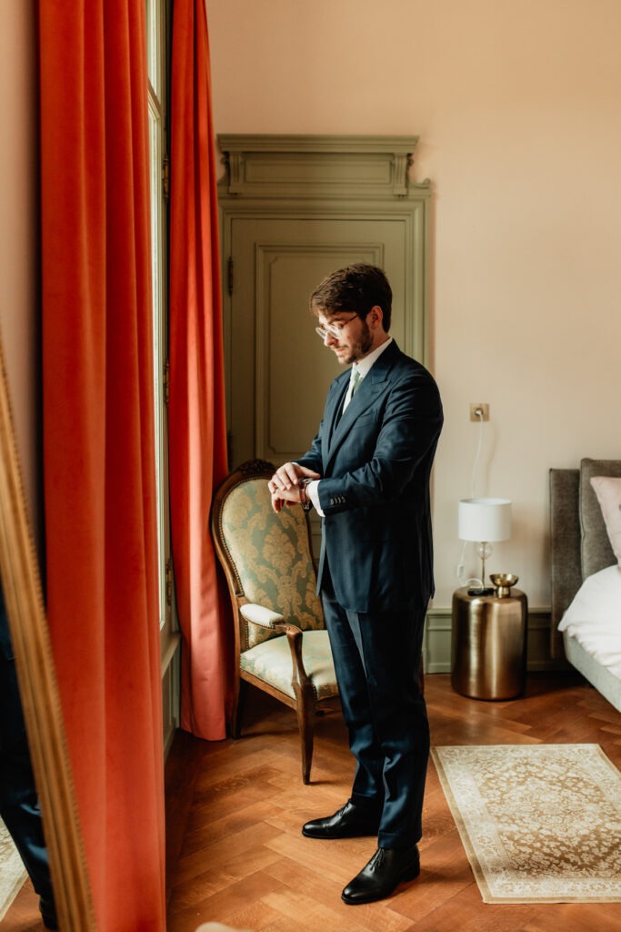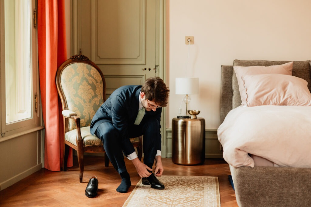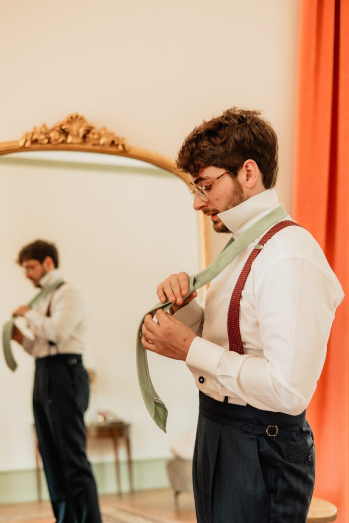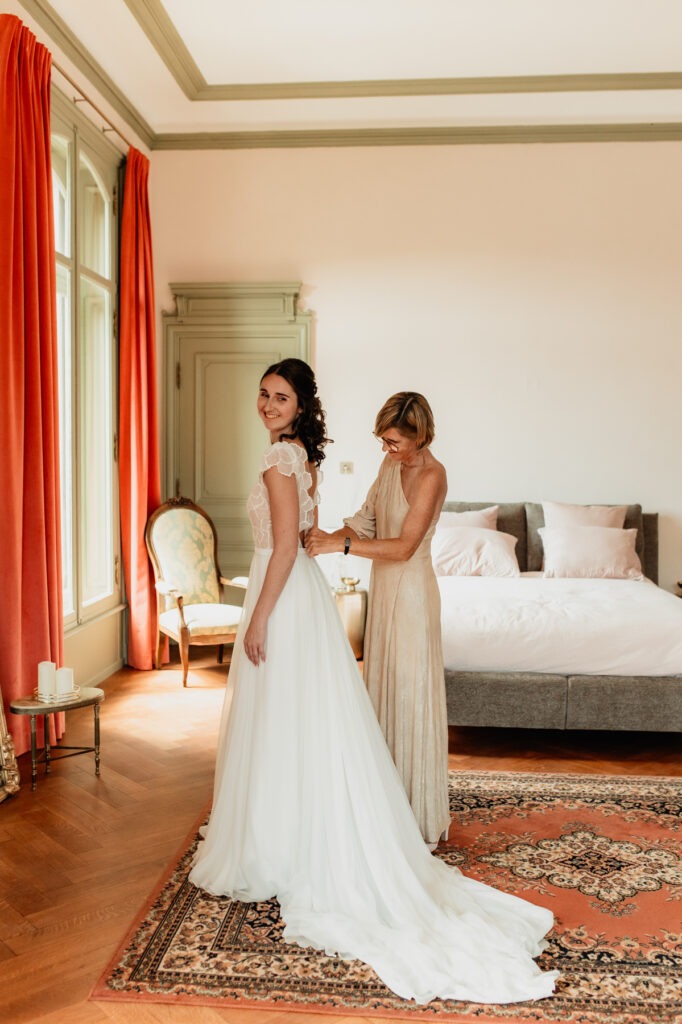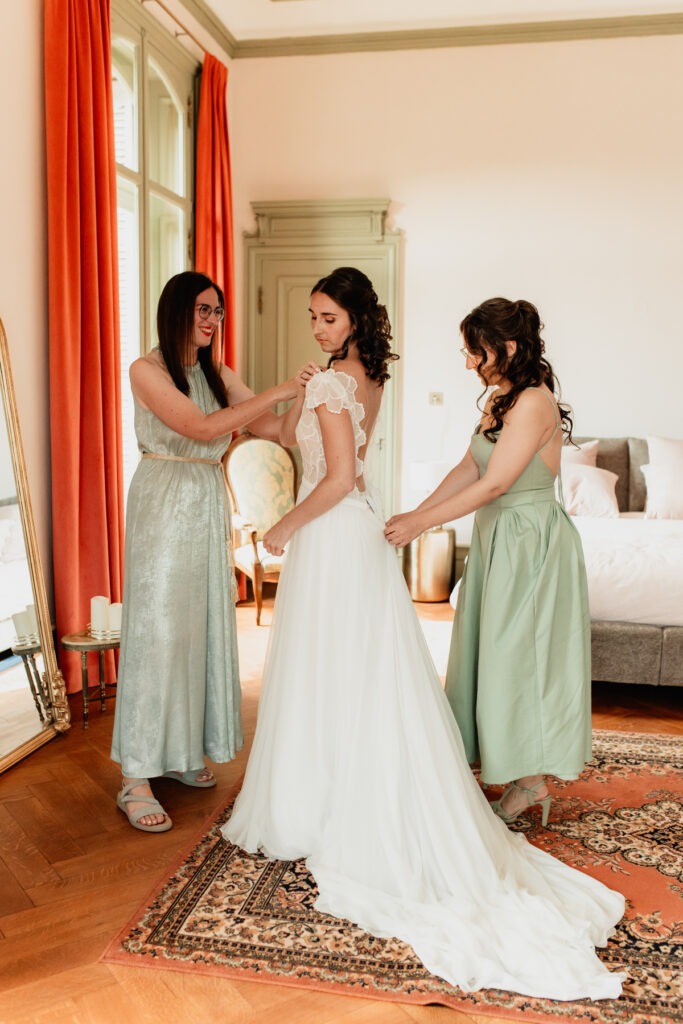 Ils ont choisi de débuter cette journée dans un écrin tout particulier : la chambre nuptiale du Château Burrus, tout juste achevée. Un lieu intime, lumineux et soigneusement décoré, idéal pour des préparatifs empreints de sérénité et d’élégance.